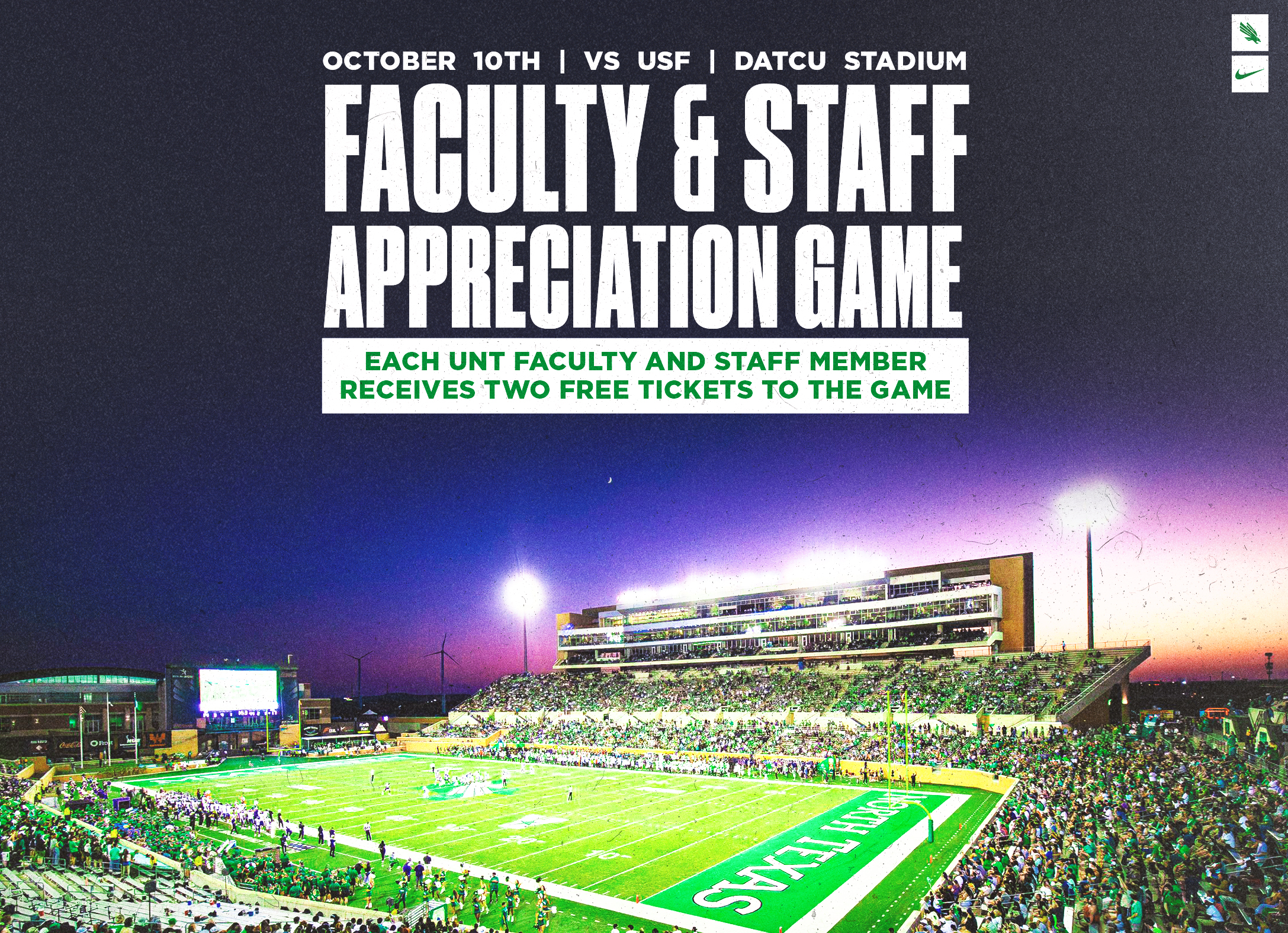 UNT Athletics would like to show our appreciation to all UNT Faculty and Staff by offering you two (2) free general admission tickets to the UNT vs. South Florida football game on Friday, October 10th at 6:30pm!